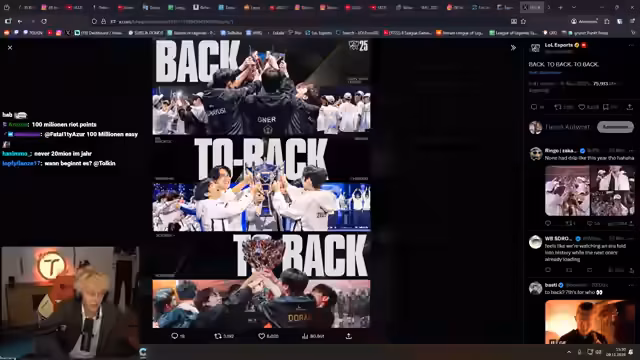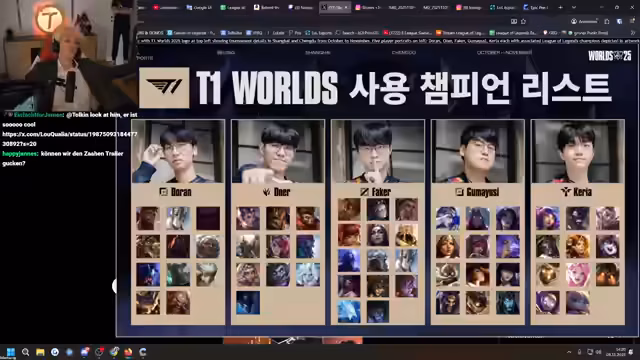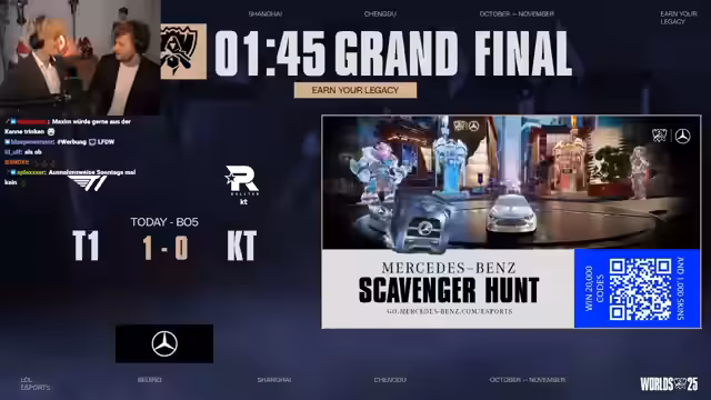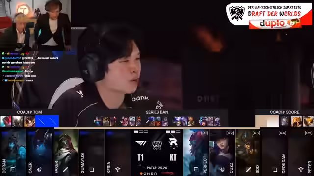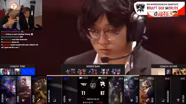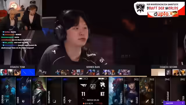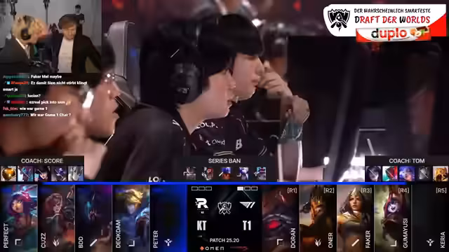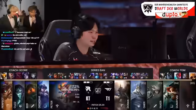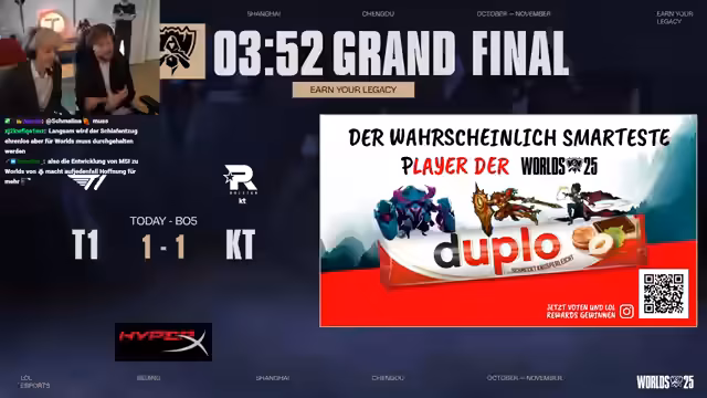 11:41:49Es wird ein Duplo-Gewinnspiel beworben, bei dem Hextech-Truhen und Schlüssel gewonnen werden können, indem man den potenziellen Gewinner des VP-Titels in die Kommentare schreibt. Das Gewinnspiel endet, sobald die Series feststeht. Anschließend wird der Draft analysiert, wobei die Freude über das Nicht-Sehen von Nico zum Ausdruck kommt, da das Casten schwierig war und der letzte Kampf verwirrend. Es wird die Leistung des Junglers Kass gelobt, der in beiden Early Games entscheidend war und das Team nach vorne brachte, insbesondere mit Y, einem Champion, der bei der WM eine schlechte Statistik aufweist. Die Blue-Side-Wahl von T1 im Finale wird thematisiert, da sie in der gesamten Swiss-Stage nur einmal die Blue-Side hatten. Es wird diskutiert, welche Champions in der Meta verbleiben und welche gebannt oder gepickt werden könnten, wobei die Bedeutung von Oriana und Azir für Bididi hervorgehoben wird.