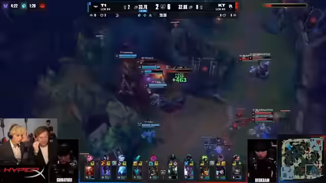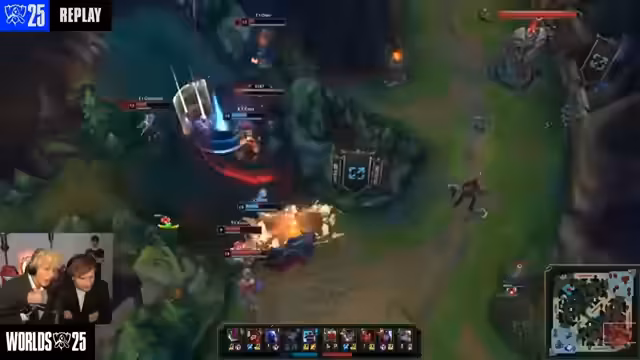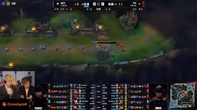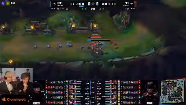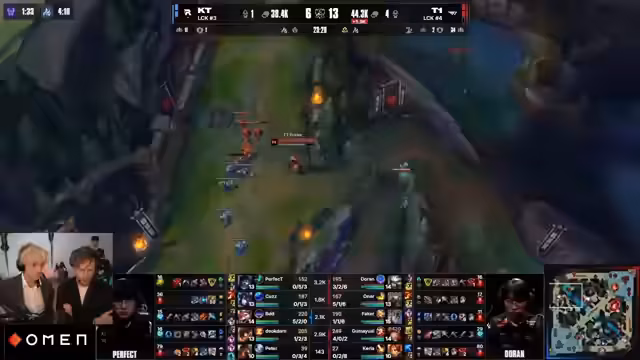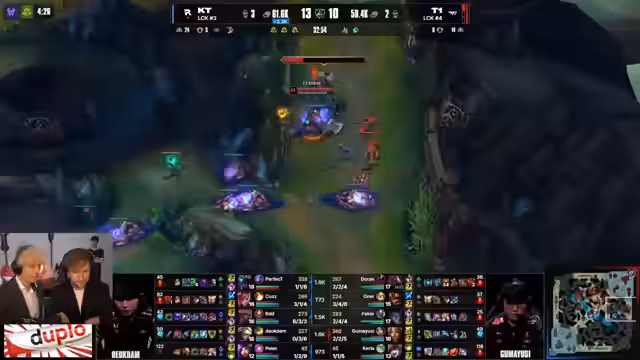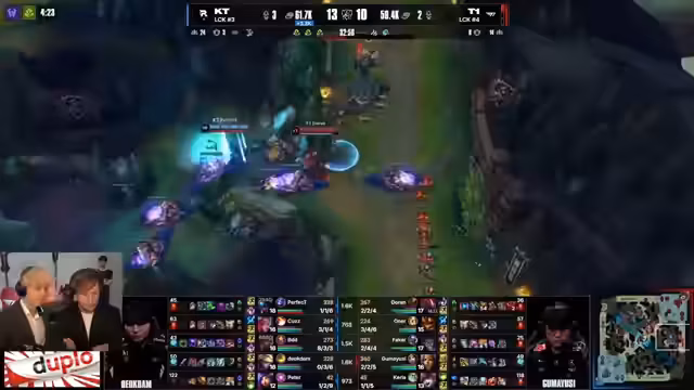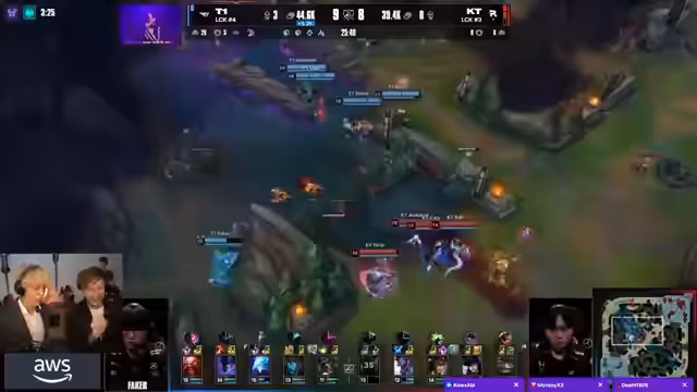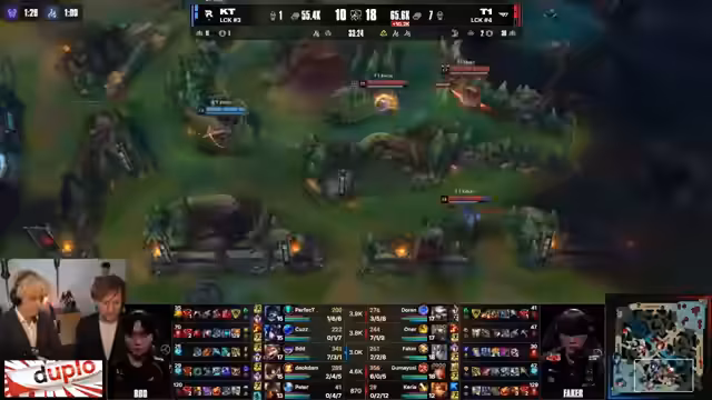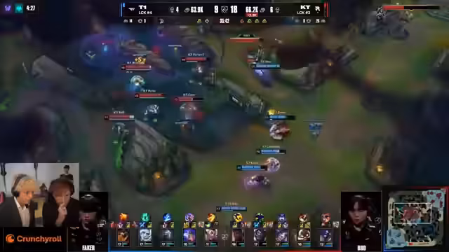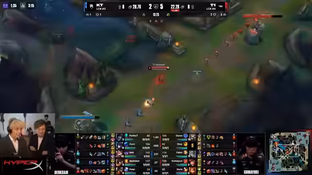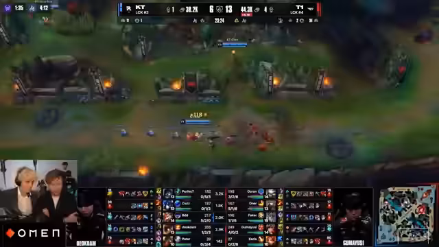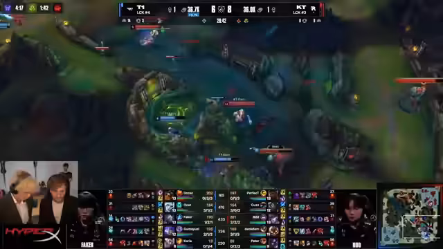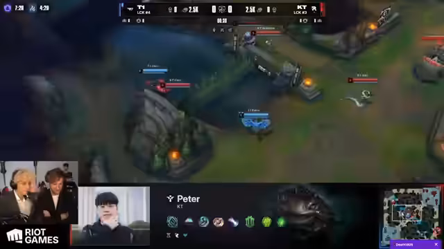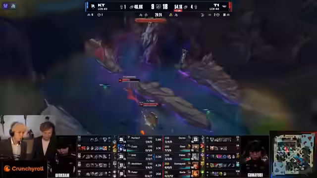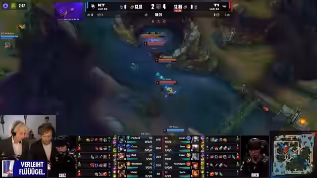10:05:49Nach einer Phase der Dominanz durch KT gelingt T1 ein beeindruckendes Comeback. Ein entscheidender Teamfight am Drachen, bei dem T1 sich erfolgreich wehrt und Kills erzielt, markiert den Wendepunkt. Besonders hervorzuheben ist Keria, dessen Poppy-Spiel und präzise Engages das Team maßgeblich unterstützen. Die Fähigkeit von T1, sich aus scheinbar aussichtslosen Situationen zu befreien und den Goldvorsprung von KT zu eliminieren, wird als „kompletter Swaparoo“ beschrieben. Die Diskussion über die Stärke von Items wie Sunfire Aegis und die Bedeutung von Armor-Penetration zeigt die taktische Tiefe des Spiels. T1 nutzt den Momentumwechsel, um Druck aufzubauen und weitere Ziele auf der Karte zu sichern, während KT zunehmend Schwierigkeiten hat, Gegenwehr zu leisten.