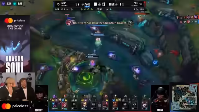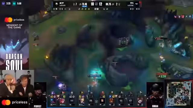 12:17:26Ein langer und intensiver Drachenkampf entfaltet sich, bei dem Redemption-Fähigkeiten mehrmals eingesetzt werden. Faker gerät in Gefahr, kann sich aber behaupten. Trotz des Kampfes wird der Drache von KT gesichert. Besonders hervorzuheben ist die Leistung von Kassante (Mundo), der scheinbar unbesiegbar ist und mit mehr HP aus dem Kampf hervorgeht, als er hineingegangen ist. KT nutzt die Situation, um den Drachen zu nehmen, verliert aber Atakan und den Teamfight. Faker kann mit Flash überleben, doch Kassante bleibt das Hauptproblem für T-Won. Seine Fähigkeit, Teamfights zu carryn und nach vorne zu pushen, ohne dass ihm jemand Einhalt gebieten kann, ist entscheidend. Die Spielsituation wird als sehr 'geswingt' beschrieben, wobei KT Vorteile durch den Drachen und XP-Vorteile im Jungle erlangt, während T-Won Schwierigkeiten hat, Schaden zu verursachen, insbesondere Viktor.