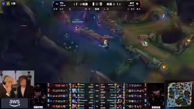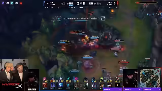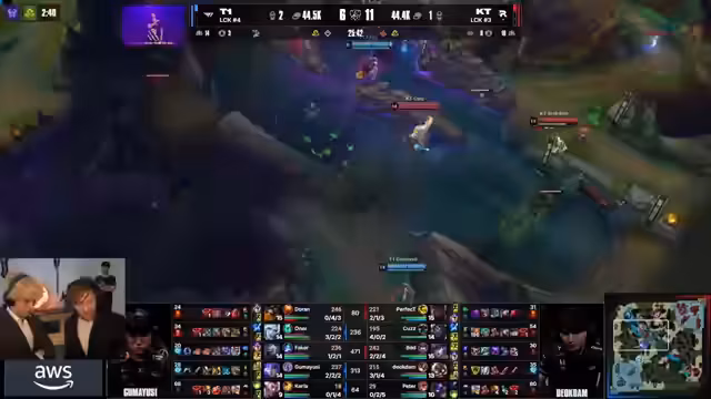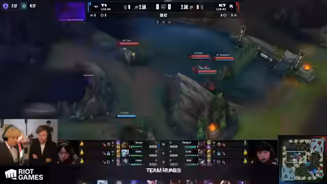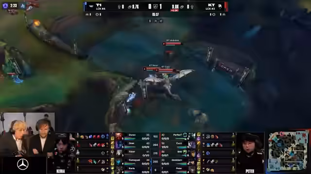 11:26:01GumaYusi wird von Niko und Vay gecombot und stirbt, da T1 keinen Schaden hat, um ihn zu schützen. Obwohl BDD ebenfalls stirbt, sichert KT die Seele und hat im nächsten Fall Flash bereit, was für sie vorteilhaft ist. Die Frustration bei T1, insbesondere bei Tom, ist spürbar. Peter wird für seine entscheidende Rolle im Teamfight gelobt, da er Seawir fängt. GumaYusi trägt eine große Last, während Faker statisch zurückfällt. T1 ist schwächer, wenn sie engaged werden, da sie ohne ihren Carry keinen Schaden haben. KT nutzt dies aus, um den Baron zu sichern, nachdem Doran gefangen wurde. KT drängt auf das Ende des Spiels, zerstört die Mid-Lane-Inhibitoren und sichert den Sieg, um die Serie auf 1:1 auszugleichen.
