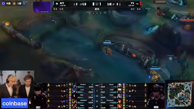 12:14:52KT beginnt, den Baron Nashor zu nehmen, während T1 den Nexus angreift.KT ignoriert dies, da sie den Vorteil des Baron Buffs für sich nutzen wollen. Ein anderer Versuch von KT, in die Nexus-Türme einzudringen, scheitert, aber KT bleibt klar im Vorteil. Das Spiel neigt sich dem Ende zu und es scheint auszusehen, dass KT das Spiel für sich entscheiden wird, um die Serie auf 2-1 zu stellen und einen historischen Sieg gegen T1 zu erringen.
