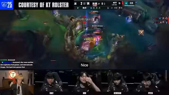 14:12:46T1 gewinnt einen Trade gegen KT, obwohl Doran zu aggressiv agiert und zwei Spieler verliert. Doran versucht zu viel und stirbt unter dem zweiten Turm, was KT neue Hoffnung gibt. Trotzdem bleibt T1 im Vorteil, da Owner im gesamten Worlds-Turnier eine starke Leistung zeigt. Guma Yuzi wird für seine Miss Fortune-Performance gelobt, die entscheidenden Schaden verursacht. Die Telecom Wars zwischen SKTT1 und KT finden im finalen Spiel eine neue Iteration, wobei Guma als Difference Maker hervorgeht. T1 terrorisiert die Botlane und zerstört Inhibitoren, während BDD Level 16 erreicht. KT versucht, den Nash zu verteidigen, während T1 die Soul in Betracht zieht. Trotz Dorans wiederholter aggressiver Plays bleibt T1 im Vorteil. T1 nimmt den Drake und damit die Seele, während KT sich auf Nash konzentriert, um die Worlds zu entscheiden. T1 gewinnt das Spiel und sichert sich den Weltmeistertitel, während Fakers Tränen ausbleiben. Doran feiert seinen ersten World Twin, und T1 setzt seine Dominanz fort.