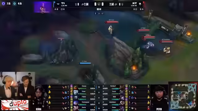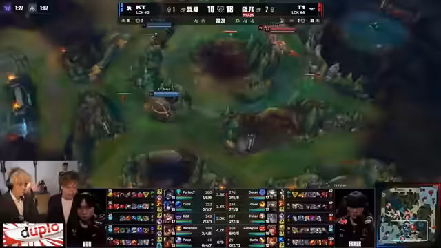 09:52:07KT setzt seine Dominanz im Early Game fort und baut seinen Goldvorteil aus. Nach dem First Blood gelingt es KT, weitere Kills zu erzielen und T1 unter Druck zu setzen. Ein weiterer aggressiver Play auf der Top-Lane führt zu einem Kill für KT und einem Flash-Verlust für T1s Top-Laner. Die Bot-Lane von T1 wird erneut angegriffen, was zu einem weiteren Kill für KTs Jungler führt. Diese Kette von Ereignissen resultiert in einem deutlichen Goldvorteil von fast 3.000 Gold für KT nach nur zwölf Minuten Spielzeit, was für ein koreanisches Spiel ungewöhnlich schnell ist. T1 wirkt in dieser Phase des Spiels überfordert und macht Fehler, die von KT konsequent bestraft werden. KT sichert sich auch den ersten Drachen, was ihren Vorteil weiter festigt. Die Item-Spikes von KT, insbesondere Triforce für Wukong und Kraken für Ash, kommen frühzeitig online und verstärken ihre Kampfstärke. Die Kommentatoren sind überrascht von der Geschwindigkeit und Aggressivität des Spiels, die nicht dem typischen ruhigen koreanischen Spielstil entspricht. Es wird spekuliert, dass T1 möglicherweise mit einem negativen Mindset in das Spiel gegangen ist oder versucht, den Gegner weichzuklopfen.