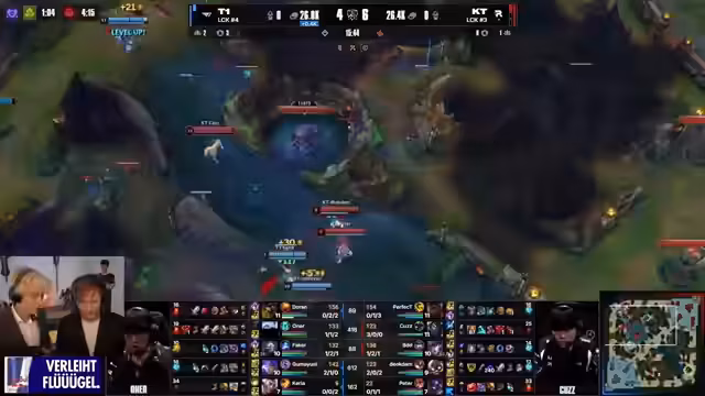 10:14:16Die Teams positionieren sich langsam am Baron-Nashor. T1 möchte den Gegner zum Kampf provozieren, während Poke-Damage im Fokus steht. Timon wird in einem 1-gegen-1 von Faker besiegt und verliert dabei erhebliche Lebenspunkte. KT versucht, die Initiative zu ergreifen, wird aber von T1 zurückgehalten. Es wird kritisiert, dass KT am Anfang des Spiels sehr wenig Reichweite hat und ihre Champions aggressiv ins Fight gehen müssen, während Faker mit seiner Stopwatch zusätzliche Sicherheit bietet.