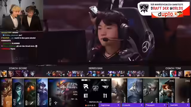 11:47:26In der Draft-Phase für Spiel 3 zwischen KT und T1, dem amtierenden Weltmeister, wählt T1 erstmals die blaue Seite. Es wird diskutiert, dass ein Hat-Trick für T1 in den Jahren 2023-2025 angestrebt wird, aber KT ein Wörtchen mitzureden hat. Die Fans sind gespannt, wer der nächste Weltmeister wird. Zunächst werden Wan und Johan gebannt, was auf einen Tank-Pick in der Top-Lane hindeutet. Die Frage, ob Oriana oder Yunara wichtiger ist, wird im Chat diskutiert. Oriana wird von KT gebannt, woraufhin KT den Mundo von G2 pickt. Die Fähigkeiten von Mundo werden erläutert, insbesondere seine Axt, die nicht durch Minions fliegen kann, und seine Ult, die ihn CC-immun macht. Die Stärke von Yunara als Hypercarry wird betont, da sie trotz Mundos Tankiness genug Schaden hat, um ihn zu töten. Es wird auch über die Möglichkeit gesprochen, Mundo in der Top-Lane zu spielen, obwohl er bisher nur im Jungle eingesetzt wurde. Die Draft-Strategie von T1 wird diskutiert, wobei ein starker Tank-Pick und die Einschränkung von Faker's Champion-Pool angestrebt werden.