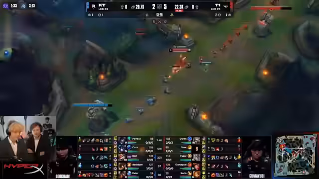 11:28:30KT nutzt seinen Goldvorteil und die Souls, um den Nexus-Turm anzugreifen. Mit drei gestapelten Wellen und dem Baron Nashor verschaffen sie sich einen unmöglichen Vorteil. T1 versucht verzweifelt, die Situation zu drehen, doch KT bleibt durchhält. Ein letzter Teamfight führt zum Knockout von T1, als KT durchzieht und den Nexus stürmt. Das Spiel ist mit einem klaren Sieg für KT zu Ende, die den Screenshot feiern und die Serie auf 1-1 ausgleichen.