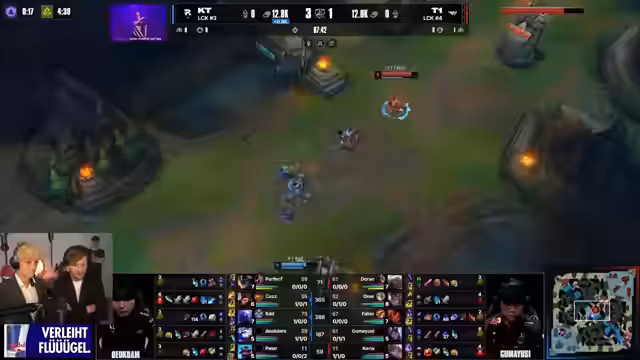 12:11:12KT erarbeitet sich durch einen genialen Flankzug mit Viego (No Docklamm) eine entscheidende Chance. Durch den Einsatz von Teleport und Flash erreicht er eine perfekte Position hinter der gegnerischen Linie. Obwohl No Docklamm ohne Ressourcen wertlos ist, hat er mit seinen Items anti-healing und Penetration jetzt genug Durchschlagskraft, um einen Champion wie Mundo zu töten. Dieser Zug macht das Spiel wieder ungleich interessanter und zeigt, wie entscheidend die Item-Builds im Verlauf des Spieles sind.