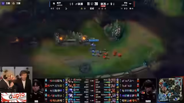 11:25:34Das Spiel endet in einem weiteren engen Teamfight, bei dem beide Seiten ihre jeweiligen Carries verlieren. Guma von KT wird von T1 getradet, während der gegnerische Carry ebenfalls eliminiert wird. KT erhält im Gegenzug den Soul und andere wichtige Ressourcen. Obwohl der Kampf knapp ist, zeigt KT eine starke Präsenz und nutzt die gewonnenen Vorteile, um den Druck auf T1 aufrechtzuerhalten. Das Momentum ist klar bei KT, das sich nun in einer dominanten Position befindet.