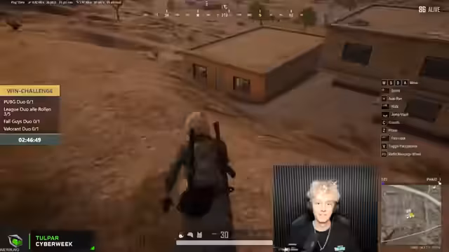 02:21:25Die Challenge besteht darin, mit Zuschauern in verschiedenen Spielen zu gewinnen. Nach dem erfolgreichen League-Spiel folgt PUBG. Der Streamer äußert Bedenken, da PUBG sehr zeitaufwändig und für unerfahrene Zuschauer schwierig ist. Die Abhängigkeit von der Leistung des Partners und die lange Dauer einer Runde machen es zum potentiellen 'Bruchstein' der Challenge. Trotzdem beginnt das Duo mit PUBG.