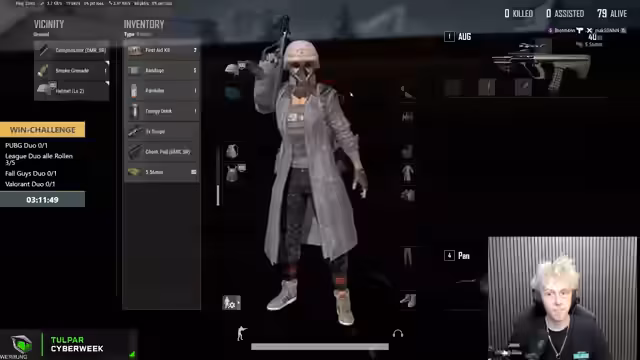 01:52:40Nachdem das League-Spiel beendet ist und die Gewinner ihre Preise erhalten haben, kündigt der Streamer eine Verlosung von Laptops und Controllern an, die im Rahmen der Cyber Week stattfindet. Anschließend wechselt er das Spiel und spielt eine Runde PUBG, nachdem er es extra für den Stream heruntergeladen hat. Das Duo-Format mit Zuschauern wird als 'nice' und 'entspannt' bezeichnet, da die Community als sehr sympathisch gilt.