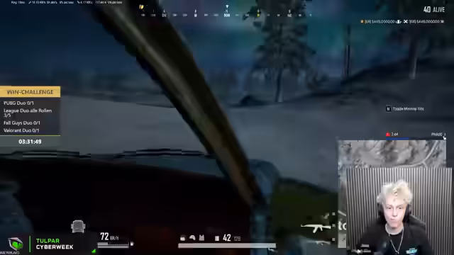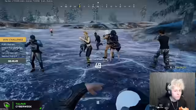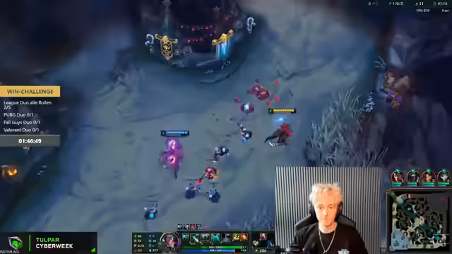 08:46:50Trotz einiger schwieriger Phasen und des Todes des Streamers gelingt es seinem Team, das League of Legends-Spiel zu gewinnen. Dieser Erfolg ist ein wichtiger Schritt in der WinChallenge. Danach wechselt der Streamer wieder das Spiel, diesmal zu PUBG. Es wird die Theorie diskutiert, dass PUBG das schwierigste Spiel der Challenge sei und die Lobby nachts aus Bots bestehen könnte, was die Chance auf einen Sieg erhöhen würde.