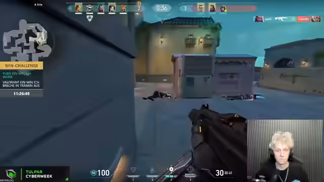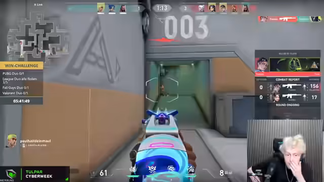 07:09:08Nachdem der bisherige Mitspieler ausfällt, wird schnell ein neuer Spieler namens Riox rekrutiert. Das Duo startet einen neuen Versuch in Valorant. Während des Spiels gelingt dem Streamer und seinem Mitspieler ein beeindruckender Penta-Kill in einer Runde. Dies wird als entscheidender Durchbruch gefeiert, die Moral ist hoch und sie sind zuversichtlich, das Spiel noch drehen zu können, obwohl der Rückstand weiterhin groß ist.