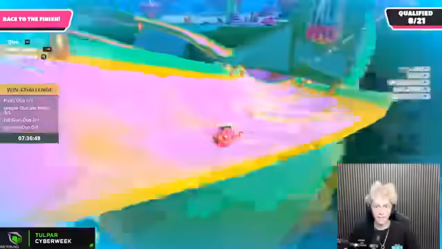 07:50:33Das Duo aus Streamer und Snob2k beginnt ein Fall Guys-Spiel. Es gibt anfängliche technische Schwierigkeiten mit der Steuerung und der Kameraperspektive. Nachdem diese behoben sind, spielen sie eine erste Runde, in der sie knapp an der Qualifikation für die nächste Runde scheitern. In der zweiten Runde gelingt es ihnen jedoch, sich im Team-Ranking einen Platz unter den Top 12 zu sichern, wodurch sie die Challenge erfolgreich abschließen.
