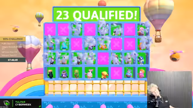 07:45:28Trotz des heroischen Penta-Kills ist das Valorant-Spiel letztendlich verloren. Der Streamer gibt sich selbst die Schuld und beschreibt das Spiel als frustrierend und anstrengend. Er kündigt daraufhin an, das Event mit einem anderen Spiel fortzusetzen: Fall Guys. Die Challenge wird definiert, dass einer von beiden die Krone holen muss, um als erfolgreich zu gelten. Schnell wird ein weiterer Zuschauer namens Snob2k für ein Duo-Game eingeladen.
