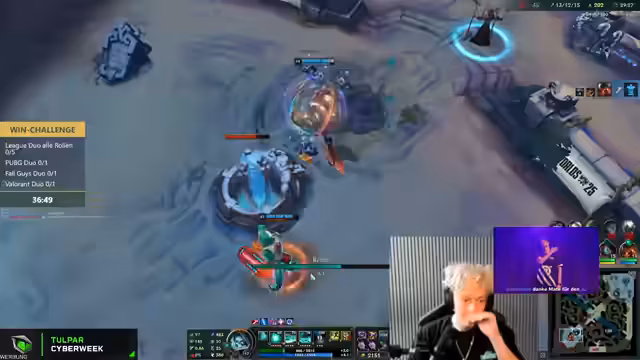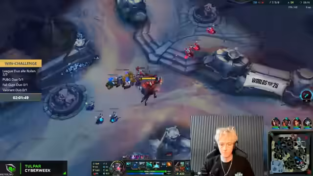 08:17:37Nach dem Ausscheiden in Fall Guys wechselt der Streamer das Spiel und kündigt League of Legends an, um die Challenge fortzusetzen. Er sucht aktiv nach einem Zuschauer, der als Top-Laner ins Team springen kann. Es wird eine Partnerschaft mit einem Spieler namens Pizzarider etabliert. Im Vorfeld der Partie wird über die Championswahl und die Rollen im Team gesprochen, wobei eine Draft mit Mordekaiser als Top-Laner geplant wird.