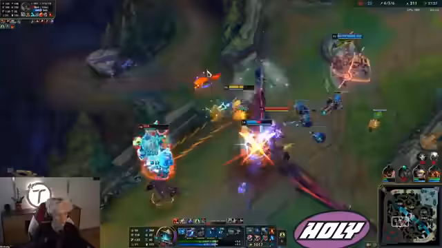 01:05:06Der Streamer kommentiert einen spezifischen Spielzug im aktuellen Spiel, in dem die gegnerische Botlane in eine Falle läuft, weil sie trotz voller Information über die Position der Sejuani reagiert. Er kritisiert den 'unglaublich inefficienten' Permaslow und stellt fest, dass der 'AD-Carrier' defensiv flashen musste, obwohl die Sejuani aufgescout war. Der Spielzug wird als 'low elo' und 'disaster' bezeichnet und zeigt einen klaren taktischen Fehler, der zum ersten BF-Sword führte.