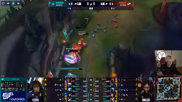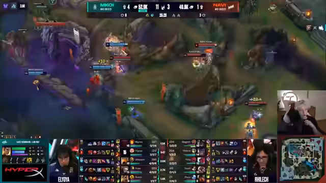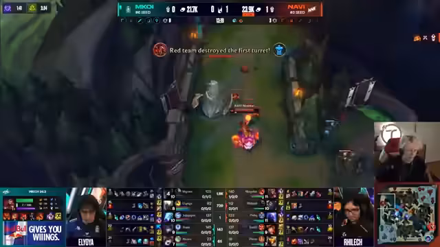 07:47:39Während der Live-Übertragung der Playoffs konzentriert sich der Kommentator auf das objektive Spiel. Er analysiert die Positionierung der Wards und die daraus resultierenden Vorteile, besonders im Jungle. Die besondere Stärke von Navi, den ersten Drake in 81% der Spiele zu holen, wird als beeindruckend hervorgehoben. Der Kampf um die Krabbe und die daraus resultierenden strategischen Entscheidungen im Jungle stehen im Mittelpunkt, da sie den frühen Spielverlauf maßgeblich beeinflussen können.