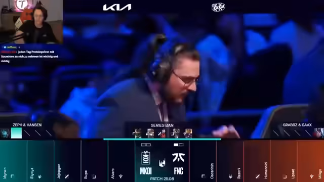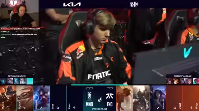 06:12:03Der Fokus liegt auf der Draft-Phase von Game 1 zwischen Fnatic und MCOI. Standard-Picks wie Varus und Viktor sind bereits gebannt. MCOIs Oskar wählt den ungewöhnlichen Jace gegen Rumble, was Mervyn sofort hinterfragt. Fnatic reagiert mit einem Warwick-Pick, der von Broken Blade popularisiert wurde, und einer Comp, die darauf abzielt, ein Ziel zu isolieren und mit globalen Fähigkeiten (Warwick-Ult, Pantheon-Ult etc.) auszuschalten.