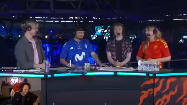 06:22:56Die Stimmung in der Arena in Madrid wird als extrem beschrieben, fast noch intensiver als in München. Die Mehrheit der Zuschauer trägt Movistar-Jerseys, was den Eindruck erweckt, dass Movistar favorisiert ist. Der Chat hingegen ist überwiegend auf der Seite von Fnatic. Der Streamer stellt fest, dass Fnatic oft zu früh in der Saison stark ist und einen Slump am Ende hat, während es heute anders aussehen könnte.