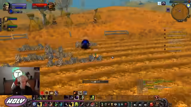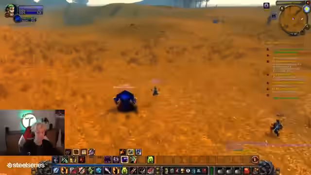03:32:41Ausführliche Beschreibung des WoW-Griefings: Ein wiederkehrender Level-60-Spieler auf einem Puster ritt mit Elitemobs (u.a. Skelett-Karsus) durch die Gegend, pullte unzählige Gegner und überrollte den Streamer. Dies passierte mehrmals, bis er von einer Gruppe von 5+ Spielern und Mobs getötet wurde. Er erwähnt einen Staubteufel-Mob als zusätzliche Bedrohung.