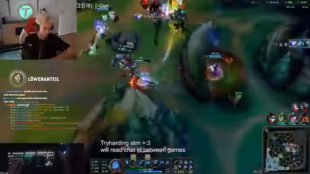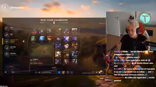 03:13:36Der Streamer interagiert mit dem Chat, unter anderem über World Skins und die Leistungen von Spielern. Es wird erwähnt, dass ein Spieler schnell Jungle Challenger werden könnte. Der Streamer berichtet auch von seiner eigenen Erfahrung im Ranked-Modus und den Stress, den er während der Relegationsspiele empfindet, da ein Verlieren nicht erlaubt ist.