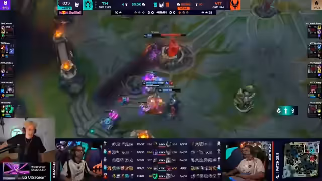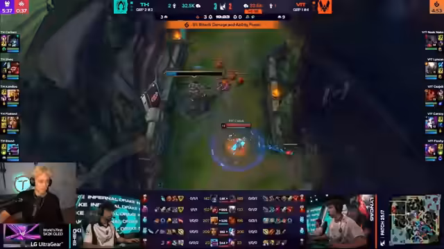 08:10:15Vitality demonstrierte in Game 2 exzellentes Map-Control. Nach einem frühen Kill auf der Bot-Lane nutzten sie den Druck, um die Top-Lane zu pushen und den Gegner in die Defensive zu zwingen. Dies ermöglichte es, den ersten Drake sicher zu kontrollieren und zu kappen. Die strategische Nutzung von Recall-Prioritäten und die klare Trennung der Map zeigten die Dominanz von Vitality in der Mid-Game-Phase. Das Team agierte koordiniert und nutzte jede Gelegenheit, um den Goldvorteil auszubauen.