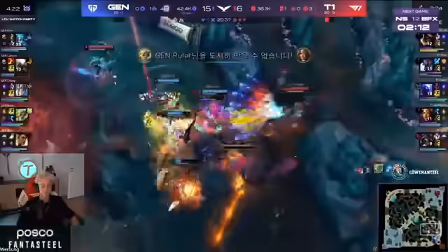 00:39:33Im weiteren Verlauf von Game 1 macht Nongshim, insbesondere Lahenz, strategische Fehler. Statt das Tempo aufrechtzuerhalten und nach späten Picks zu suchen, wird die Aggression zu früh gestartet. Dies führt zu einem Teamfight, in den Vikla von BFX mit einem Portal-Call einzieht und die Aggro von vier Gegnern auf sich zieht. BFX kann den Kampf für sich entscheiden und die Map-Kontrolle zurückgewinnen.