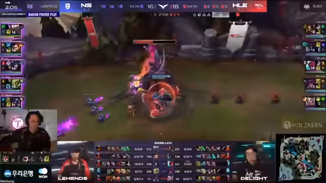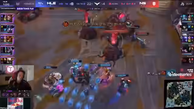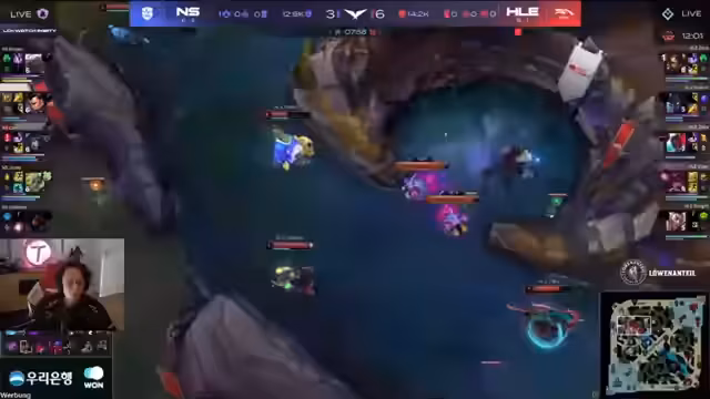 03:38:03Der Fokus verlagert sich auf das laufende Spiel der LCK zwischen Hanwha Life und Nongshim RedForce. Hanwha Life dominiert mit einem massiven Goldvorteil von 7000 und kontrolliert mehrere Drachen und Türme. Trotzdem unterliegt das Team in einem kritischen Teamfight, in dem Nongshims Kalix einen Triple Kill landet. Sprecher und Chat diskutieren die Risiken von Bounty-Verlusten nach verlorenen Kämpfen, die den Vorsprung gefährden können.