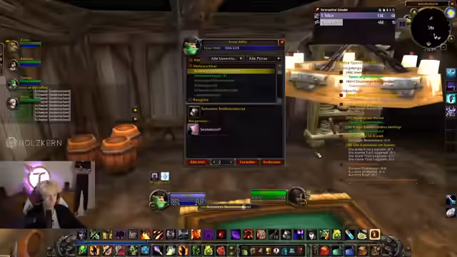 05:09:33Ein Gildenmitglied benötigt zwölf Seidenstoff für eine Tasche. Der Streamer, der sich als Schneider betätigt, bietet an, mehrere Taschen herzustellen und Stoff abzugeben. Dies geschieht, während die restliche Gruppe ihre aktuelle Quest zu Ende bringt und auf den Tank für den bevorstehenden Dungeon wartet. Das Gespräch zeigt die gute Organisation und den Hilfsgeist innerhalb der Gilde.