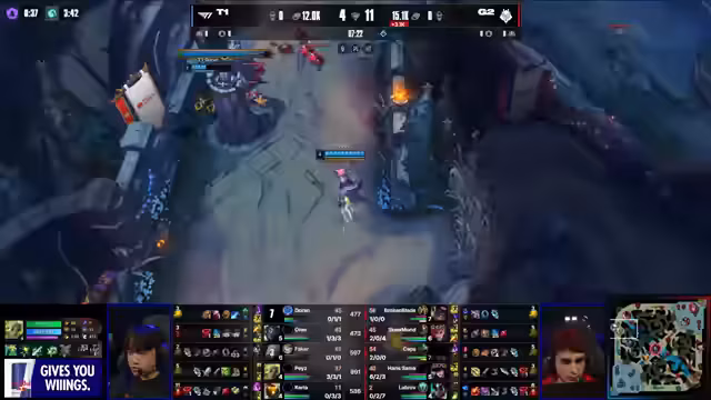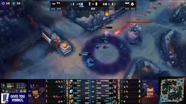 04:18:37Das erste Spiel gegen T1 beginnt für G2 mit einem kritischen Fehler. Carrier startet mit Boots und Doran's Blade, um aggressiv zu sein, erleidet jedoch einen Double Kill an den Händen von Doran. Obwohl G2 später in das Spiel kommt, insbesondere durch einen Gank von ON auf dem Mundo, der einen Kill holt, liegt der Fokus auf der frühen Dominanz von T1 und dem unerwarteten Start, der die G2-Strategie durchkreuzt.