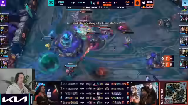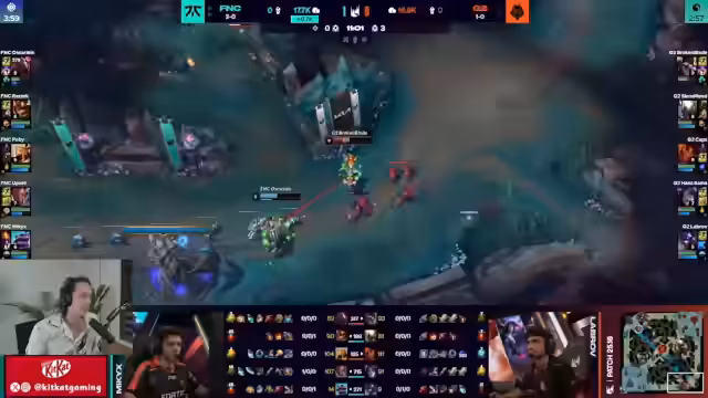 08:25:21Das Spielverlauf ist geprägt von strategischen Entscheidungen und taktischen Manövern. Fnatic nutzt den Druck in der Bot-Lane, um einen erfolgreichen Gang durchzuführen, und sichert sich dabei wichtige Ressourcen wie Honigfrüchte. G2 versucht mit der Positionierung von Kai'Sa in der Top-Lane, den Spielverlauf zu kontrollieren. Der Fokus liegt darauf, wie die Teams mit dem Druck umgehen und welche strategischen Ziele sie priorisieren, um in der Mitte des Spiels einen Vorteil zu erlangen.