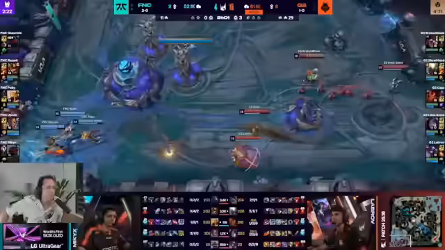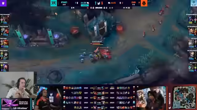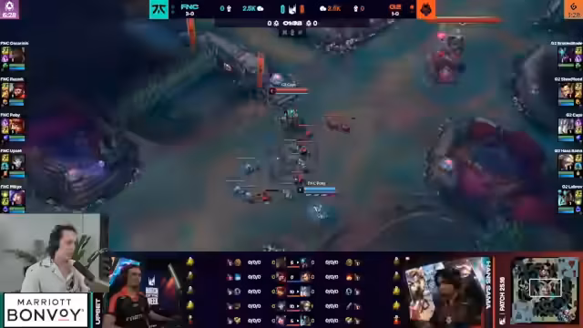 09:25:46G2 zeigt überlegene strategische Führung und dominiert die Teamkämpfe, besonders im Late-Game. Durch Caps effektives Disengage mit Galio können sie lang andauernde Fights für sich entscheiden und den gegnerischen Teleport bestrafen. Fnatic wirkt zögerlich und mental gebeugt, obwohl sie nicht in Gold hinten sind. G2 hingegen agiert entschlossen und nutzt die globale Karte effektiv, um Vorteile zu generieren und schließlich den entscheidenden Nashor zu stehlen, was den Grundstein für ihren Sieg in der Serie legt.