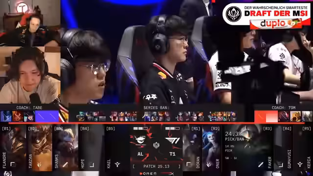 09:33:25Die Teams bereiten sich auf Game 5 vor, wobei der Draft als entscheidend gilt. Der Streamer diskutiert mögliche Picks wie Kalista Renata, Six, oder Jinx. Es wird analysiert, wie die Drafts sich gegenseitig beeinflussen und wer die Vorteile im Early-Game hat. T1 scheint sich auf eine langsame, reaktive Strategie zu konzentrieren, während AL proaktiv agieren will.