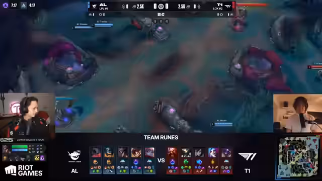 10:12:07Nach dem zwischenzeitlichen Ende der Serie analysieren die Kommentatoren die Gesamtleistung beider Teams. Sie loben AL für ihre beeindruckende Leistung während des Turniers und stellen fest, dass sie ein starkes Team sind, das in Zukunft zu beachten ist. Gleichzeitig wird die Überlegenheit von T1 betont, die sich durchsetzten konnten. Die Kommentatoren blicken bereits auf das bevorstehende Finale gegen Gen.G voraus, das als Wiederholung des Vorjahres angesehen wird und hohe Erwartungen weckt.