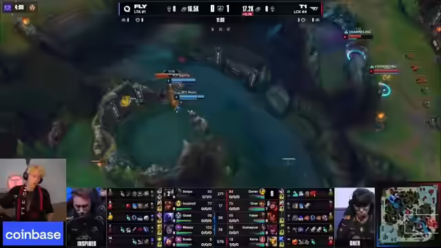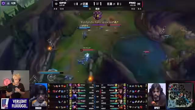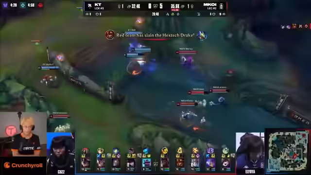 13:25:05Inspired von FlyQuest versucht, Zugang zum Drachen zu erhalten, und Owner von T1 bemerkt dies. Ryze bewegt sich, und Taliyahs Wand sowie Kerias Teleport sind verfügbar. Der erste Drachenkampf entbrennt, bei dem Doran von T1 aggressiv in den Kampf springt. Keria teleportiert sich dazu, und Bard flankiert. Trotz eines starken Engages von T1 überlebt FlyQuest den Kampf, opfert jedoch mehrere Flashes. Der Drache bleibt am Leben, und es gibt keine Kills für T1. Es wird diskutiert, ob Doran einen besseren Ult-Winkel hätte finden sollen, um einen Kill zu erzielen. Der Vorteil liegt dennoch bei T1, da Bard Level 6 erreicht hat und viele Ziele ohne Flash sind. Die Fähigkeit von Neeko, einen lebendigen Ward-Platz zu schaffen, wird als sehr vorteilhaft für die Vision-Kontrolle hervorgehoben.