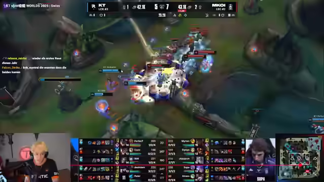 10:43:26Pobi liegt noch 1400 Gold vorne, was die Hoffnung auf Bounties nährt, obwohl er zwei Level hinter Ryze liegt. Ein Turm-Kill durch Pobi bringt Fnatic dringend benötigtes Gold, reduziert den Goldrückstand und macht Pobi zum Gold-Führer, obwohl er immer noch schwächer ist als Ryze. Ein weiterer Kill auf Ryze durch eine gute Kombo gibt Fnatic einen kleinen Vorteil. Die defensive Nutzung von Ults durch Pobi und Junjia wird gelobt, um Kämpfe sicher zu spielen. Die Bedeutung der Seele und die Notwendigkeit, sie zu vereiteln, wird betont. Die Diskussion über mögliche Ziele für Fnatic konzentriert sich auf Caitlyn und Doggo, da Ryze als zu stark angesehen wird. Die dominante Leistung von Taiwan unter Nash wird hervorgehoben, da Fnatic ohne Smite das Objektiv nicht contesten kann. Driver's aggressives Spiel und seine Fähigkeit, Flashes zu erzwingen, werden erneut gelobt. Die Niederlage von Fnatic wird als hart, aber gegen ein starkes Team wie CFO als akzeptabel bewertet. Die Draft-Entscheidungen von Fnatic werden kritisiert, da sie keine Stärken spielten und Driver mit seinen Solo-Kills das Spiel entschied. Der Ausblick auf das nächste Spiel zwischen Movistar Koi und KT Rolster wird diskutiert, wobei KT als klarer Favorit gilt, aber Movistar Koi eine Chance zugesprochen wird, wenn KT einen schlechten Tag erwischt. Die historische Leistung Europas gegen Korea, insbesondere gegen T1, wird als Argument für die Chancen von Movistar Koi angeführt, obwohl KT als Favorit bleibt. Die Geschichte von Movistar Koi und KT Rolster, sowie die Rivalität zwischen den Telekom-Teams, wird erläutert. Die Bedeutung von BDD als Starspieler für KT und seine Fähigkeit, alles zu spielen, wird hervorgehoben, während Jojo Pioner als Außenseiter gilt. Die Hoffnung auf eine schlechte Version von KT wird als einzige Chance für Movistar Koi gesehen. Die Schedule für die Worlds Games wird vorgestellt, wobei das Match zwischen BLG Hunter Thieves und T1 gegen Top E-Sports als besonders wichtig für europäische Fans hervorgehoben wird.