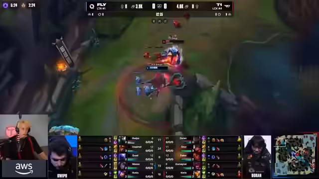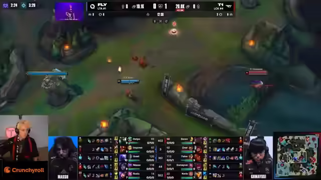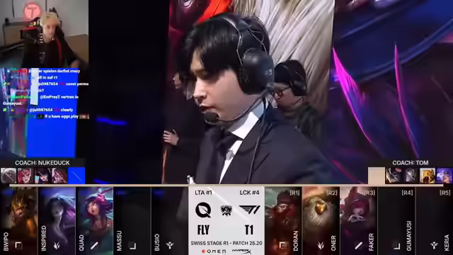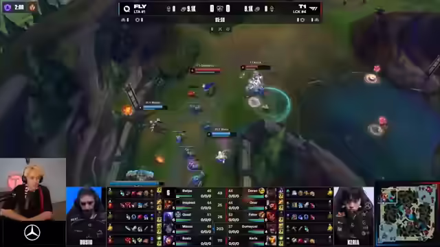 13:18:22Trotz der Bedenken in der Draft-Phase wird festgestellt, dass die Matchups auf Top- und Midlane für T1 in Ordnung sind. Faker wird voraussichtlich die Priorität in der Mitte haben, ähnlich wie im vorherigen Spiel. FlyQuest setzt auf einen counterorientierten und engage-lastigen Draft, wobei Mordekaiser und Ryze ihre Lanes dominieren sollen. Das Matchup zwischen Kai'Sa und Bard/Xayah wird als Skill-Matchup eingestuft. Im frühen Spielverlauf zeigt sich, dass Kai'Sa einen besseren Push hat, aber Bard mit seinem Q ebenfalls Druck ausüben kann. Auf der Toplane liefert sich Doran mit Kessante ein Duell gegen Bwipo auf Mordekaiser. Bwipo zeigt sich stark im Sustain und kann die Waves contesten, während Doran einen Cheater Reset versucht, der in der aktuellen Meta jedoch nicht optimal ist.