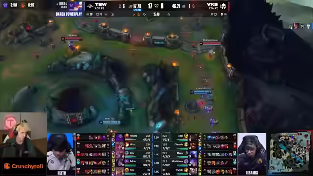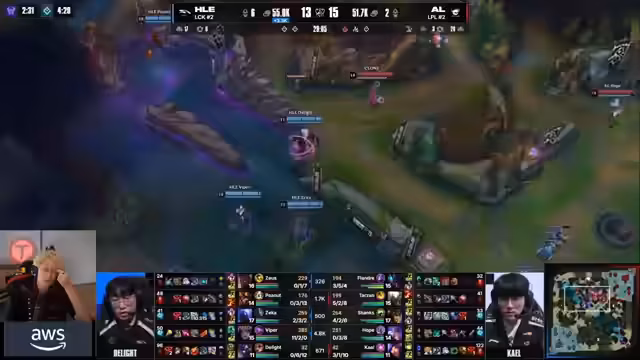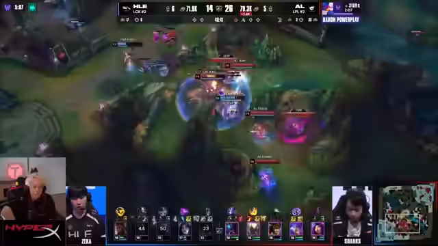 14:48:02Viper wird als Hauptzone der Koreaner und das Verderben der LPL bezeichnet, mit elf Kills von dreizehn. Peanut und Alistar spielen ebenfalls eine entscheidende Rolle bei der Vorbereitung der Teamfights für Kai'Sa. Hanwha Life belagert den Bot-Turm, während Endless Legend strategisch auf den Drachen und die Seele wartet, um die Koreaner nicht zu unterschätzen. Die LPL scheint im Vorteil zu sein, da die koreanischen Spieler ihre Rollen in Teamfights besser umsetzen können. Ryze nähert sich der Fertigstellung seines Seraph's Embrace, während die Chinesen auf Infinity Edge für Kayle warten, der 5000 Gold im Rückstand ist. Kai'Sa erwirbt Void Staff, um durch die Magieresistenz der Gegner zu kommen. Das Match wird als das knappste des Tages beschrieben, und die Chinesen wissen, dass sie den Nashor contesten müssen, da die Seele allein nicht ausreicht, um das Spiel zu beenden.