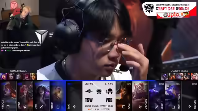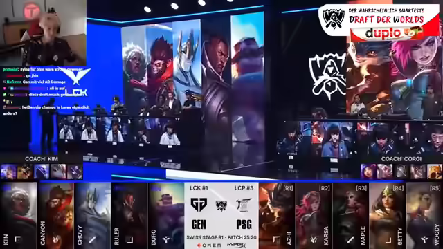 16:21:35Die Draft-Phase zeigt klassische Bans wie Orianna, was zu Picks wie Jarvan oder Wukong führt. Die Entscheidung für Wukong gegen Jarvan deutet auf eine bestimmte Strategie hin, die in Best-of-One-Spielen oft weniger Varianz zulässt. Gen.G sichert sich früh einen Galio, eine starke Kombination für Backline-Zugriff und Counter-Engage. PSG Talon überrascht mit einem Swain Midlane für Maple, einem ungewöhnlichen, aber potenziell starken Pick gegen die frontlastige Komposition von Gen.G. Swain, bekannt für seine Skalierung und Effektivität in Teamfights gegen mehrere Frontliner, könnte eine entscheidende Rolle spielen, wenn er im frühen Spiel Kills erzielt. Die Draft-Analyse deutet darauf hin, dass PSG Talon bewusst ein risikoreiches, aber potenziell lohnendes Setup wählt, um gegen den Favoriten Gen.G zu bestehen. Die Diskussion über die Mobilität von Swain im Vergleich zu Galio und die Notwendigkeit von physischem Schaden in der Komposition von PSG Talon unterstreicht die taktischen Überlegungen hinter den Picks.