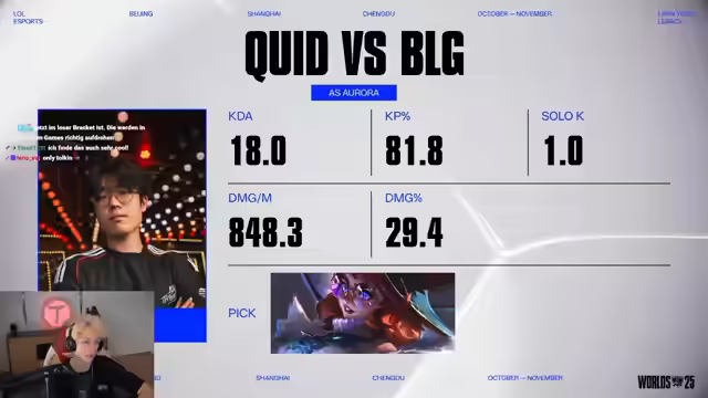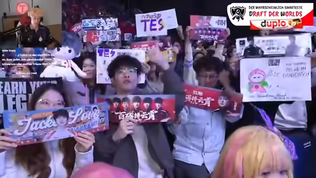 15:10:14Es wird bedauert, dass Japan dieses Jahr nicht an den Worlds teilnehmen konnte, obwohl die Zuschauerzahlen gestiegen sind. Das Match zwischen M.Koll und Dingens wird als extrem knapp und spannend beschrieben. Die Hoffnung auf G2 wird durch den Slogan „As long as there is delusion, there is hope“ untermauert. Der Kommentator bereitet sich emotional auf das Spiel vor und betont die Wichtigkeit eines Sieges für Europa. Top E-Sports wird als ein Team beschrieben, das in der Vergangenheit oft enttäuscht hat und daher in China selbst nicht die größte Fanbasis genießt. Es wird die Draft-Phase diskutiert, wobei die Banns und Picks analysiert werden. Die Wahl von Sion für Broken Blade wird als riskant, aber potenziell stark gegen 369s bevorzugte Tanks angesehen. Die Draft von Kai'Sa und Rakan für G2 wird kritisch hinterfragt, da sie als ungünstig gegen die gegnerische Komposition erscheinen könnte. Es wird die Entwicklung der G2-Spieler Skymon und Labrov angesprochen, die sich im Laufe des Jahres stark verbessert haben, was als typisch für G2s Fähigkeit zur Spielerentwicklung gilt.