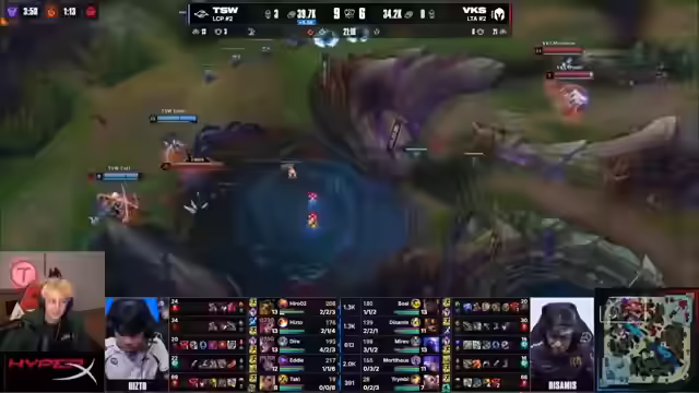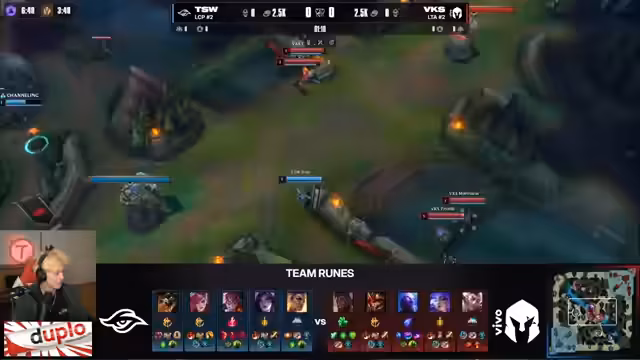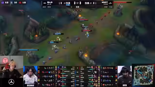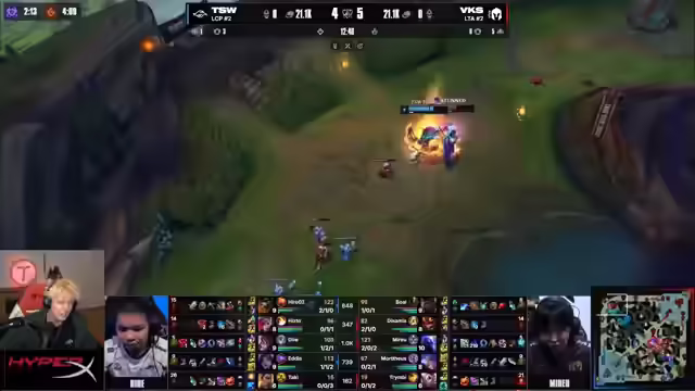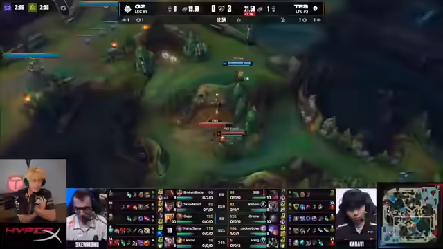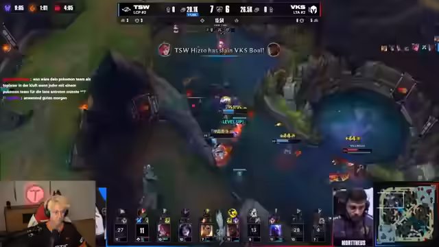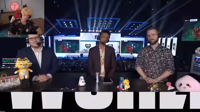 00:43:24Das Spiel beginnt mit einem aggressiven Invade der Vietnamesen, der zu einem Double Kill für sie führt. Die Brasilianer, insbesondere der Jungler Jarvan, zeigen sich unvorbereitet und müssen früh flashen. Kurz darauf erzielt der Ryze der Vietnamesen einen Solo-Kill auf der Midlane gegen Jinx, was für Verwirrung sorgt, da Ryze nur einen Doran's Ring besitzt. Beide Teams, die dieses Jahr erstmals als Hauptregionen eingestuft wurden (LCP für Vietnam, LTA für Brasilien), spielen sehr spekulativ. Die Brasilianer versuchen einen 4-30 Swap, bei dem Jinx auf die Toplane geht, während der Support auf der Botlane bleibt. Dies ermöglicht ihnen, den Drachen kampflos zu sichern, was als ungewöhnlich und potenziell riskant, aber effektiv bewertet wird. Die Moderatoren sind überrascht von den frühen Entscheidungen und dem aggressiven Spielstil beider Teams, der zu einem ausgeglichenen Spielstand führt, obwohl die Vietnamesen durch den starken Ryze einen leichten Vorteil haben. Die Diskussion über die Scrim-Bubbles wird fortgesetzt, da die ungewöhnlichen Plays auf unterschiedliche Metas und Trainingsmethoden hindeuten könnten.