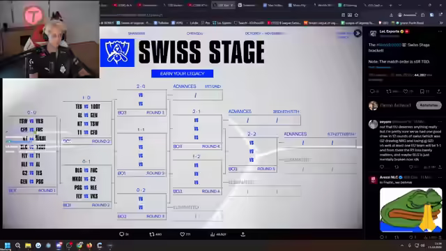 16:09:06Das Swiss-Stage-Format des Turniers sieht vor, dass Gewinner gegen Gewinner und Verlierer gegen Verlierer antreten. Jedes Spiel ist entscheidend, da drei Siege zum Einzug ins Viertelfinale führen und drei Niederlagen das Ausscheiden bedeuten. Nach dem Spiel Gen.G gegen PSG Talon erfolgt die Auslosung für die nächsten Matchups, wobei ab morgen keine regionalen Beschränkungen mehr gelten. Dies könnte zu spannenden intern-europäischen Duellen wie Fnatic gegen G2 führen, da alle europäischen Teams bisher Niederlagen einstecken mussten. Die Strategie, möglicherweise früh gegen starke koreanische oder chinesische Teams zu spielen, um diese Herausforderungen hinter sich zu bringen, wird diskutiert. Die Bedeutung des ersten Spiels für das Selbstvertrauen eines Teams wird hervorgehoben, da eine frühe Niederlage demoralisierend wirken kann. Die Erwartung an Gen.G ist hoch; ein Sieg unter 25 Minuten wird fast schon vorausgesetzt, da alles andere als ein klarer Sieg als Upset gelten würde.