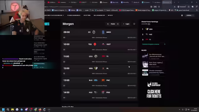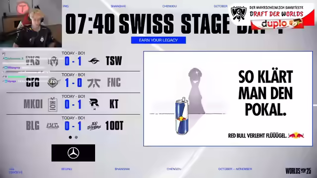 16:54:51Der erste Tag der Swiss Stage endet mit acht siegreichen und acht unterlegenen Teams. Die Auslosung für den morgigen Tag wird erwartet, wobei die Möglichkeit besteht, dass europäische Teams gegeneinander antreten, was als weniger spannend empfunden wird. Stattdessen werden Duelle wie FlyQuest gegen G2 oder andere internationale Matchups bevorzugt. Die Leistungen der europäischen Teams waren heute enttäuschend, mit einer 0:3-Bilanz. Für morgen wird jedoch auf mindestens einen Sieg gehofft, auch wenn Fnatic ein schwieriges Matchup gegen BLG erwartet. Das Spiel Gen.G gegen PSG Talon zeigte die erwartete Dominanz von Gen.G, obwohl PSG Talon tapfer kämpfte. Die morgigen Matches, darunter Gen.G gegen Animals Legend und Hanwha Life gegen PSG Talon, versprechen weitere spannende Begegnungen. Der Streamer bedankt sich bei den Zuschauern und kündigt die Fortsetzung des Streams am nächsten Morgen an, wobei er die harte Arbeit und das frühe Aufstehen für die Übertragung hervorhebt.