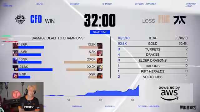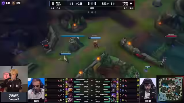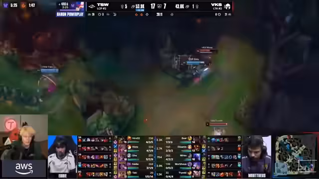 01:00:13Das Spiel beginnt früh am Morgen der Weltmeisterschaft, und das Team Secret World (TSW) zeigt bisher eine beeindruckende Leistung. Sie haben den ersten Teamplatz gewonnen und führen mit 4.000 Gold. Ihre Draft-Strategie, die auf aggressive Engagements setzt, scheint gut aufzugehen, da alle Spieler aktiv in Kämpfe springen. Ein besonders hervorzuhebendes Manöver war ein präziser Drift auf der Botlane, der zum Fall eines Turms führte. Trotz eines kleinen Fehlers, bei dem ein Turm unnötig rechargen konnte, ist die allgemeine Spielweise von TSW dominant. Hitsu, ein Spieler von TSW, der normalerweise einen geringeren Schadensanteil hat, zeigt in dieser Runde eine ungewöhnlich hohe Schadensleistung, was auf seine Rolle als Engage-Champion zurückzuführen ist, der die Ultimates seiner Teamkollegen vorbereitet.