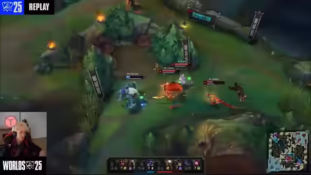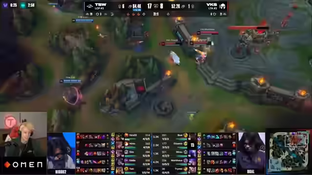 14:41:30In Minute 21 beginnt Ryze seine Reise mit null Stacks, während der Gegner bereits einen Vorteil hat. Ein Teamkampf entbrennt, in dem Zeus zu aggressiv agiert und Viper gezwungen ist, sich einzuschalten. Shanks brilliert mit einem Triple Kill, unterstützt durch ein „Petrifying Gaze“, das den Kampf rettet. Ryze wird als nutzlos beschrieben, während Shanks durch seinen Item-Spike dominiert. Trotz eines schweren Early Games für Sekka auf Ryze, der bei Minute 21 noch keine Stacks hat, muss er das Item Seraph's Embrace kaufen, da dessen Passive essenziell für seine Fähigkeiten ist. Die Teams kämpfen erneut um die Seele, wobei die Hoffnung der Koreaner durch Viper aufrechterhalten wird, der mit seinen Gift-Szenen und einem Double Kill glänzt. Die Chinesen versuchen, die Seele zu verteidigen, doch trotz eines Goldvorteils für Kai'Sa bleibt das Spiel hart umkämpft, was auf die ineffiziente Itemisierung von Ryze zurückgeführt wird.