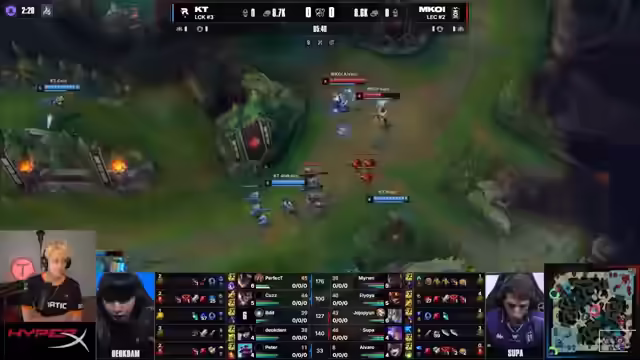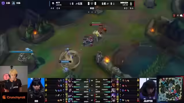11:52:16In einem kritischen Teamfight unterlief KT ein schwerwiegender Fehler, indem Senzawa isoliert gelassen und schnell ausgeschaltet wurde. Obwohl ein Disengage möglich gewesen wäre, entschied sich das Team für eine Verfolgung, die in einer verheerenden Shockwave von BDD mündete. Dies führte zum Tod mehrerer europäischer Champions, obwohl sie über wichtige Ressourcen wie Yonara Flash und Lulu Ult verfügten. Besonders hervorzuheben ist Lulus Fehlentscheidung, in die Shockwave zu laufen, anstatt eine sicherere Position einzunehmen, um ihre Carries zu unterstützen. Dieser Teamfight ermöglichte es Caitlyn, die zuvor weit zurücklag, einen Triple Kill zu erzielen und das Spiel zugunsten Koreas zu wenden, wodurch Europa seine anfängliche Goldführung und Drachenvorteile weitgehend einbüßte.
