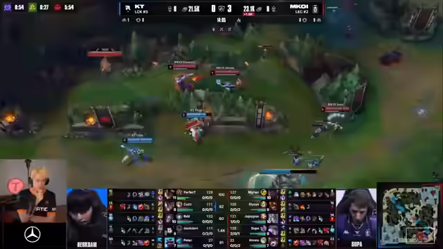 11:54:04Trotz der Rückschläge war das Spiel für Europa immer noch gewinnbar, da sie weiterhin eine leichte Goldführung und Drachenkontrolle besaßen. Jedoch führten weitere Fehlentscheidungen, insbesondere in der Midlane, zu einem erneuten Desaster. Jojo's zögerliches Verhalten und das Zeigen auf der Pink-Ward gaben den Koreanern entscheidende Informationen. Die größte Fehlentscheidung ereignete sich jedoch in der Botlane, als Yunara, anstatt von den gegnerischen Champions wegzukiten, direkt auf sie zulief. Dies führte zu einer fatalen Positionierung, bei der Yunara in die gegnerischen Reihen rannte und schnell eliminiert wurde. Diese mutwillige Entscheidung, trotz voller Vision und der Möglichkeit, sicherere Spielzüge zu machen, besiegelte das Schicksal des Teamfights und war ein entscheidender Faktor für den weiteren Verlust der Kontrolle im Spiel.