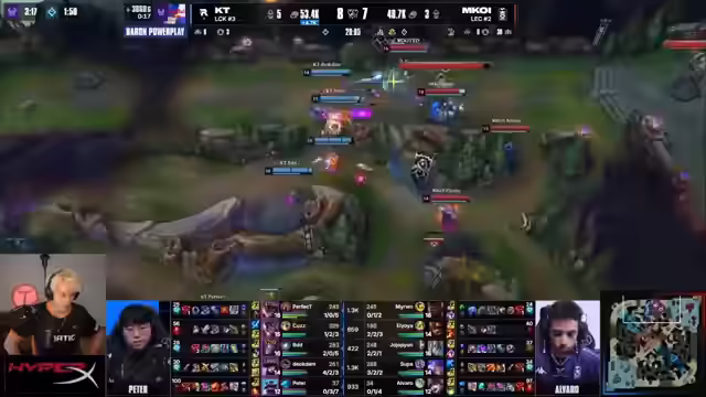 02:47:17Movistar Riders erzielt einen entscheidenden Vorteil, indem sie Braum (Peter) und Xin Zhao (Dokdam) eliminieren und sich damit einen 2:0-Kill-Vorsprung sichern. Trotz eines guten Starts und eines deutlichen Goldvorteils von 3.000 Gold, kommt es zu kritischen Teamfights, in denen Movistar Fehler macht. Insbesondere ein Teamfight um den Herald führt zu einem Desaster, bei dem Movistar nicht nur den Herald verliert, sondern auch Kills abgibt. Lulu (Alvaro) wird für ihr schlechtes Positioning und das Nicht-Nutzen ihrer Fähigkeiten kritisiert. Die Teamfights werden als 'terrible Teamfighting' von Super (Yunara) beschrieben, der in Rumble und Xin Zhao hineinläuft, anstatt zu kitem. Dies führt dazu, dass Movistar den Großteil seines Goldvorteils verliert und KT Rolster wieder ins Spiel kommt. Die Stimmung kippt von Euphorie zu Frustration, da ein scheinbar sicherer Sieg in Gefahr gerät. Die Hoffnung ruht nun auf dem Erreichen des Seelen-Buffs, um das Spiel doch noch zu gewinnen.