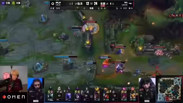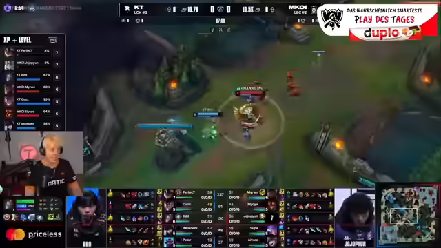 04:48:29Inspire versucht, den Drachen zu sichern, was T1 bemerkt und einen Kampf initiiert. Keria nutzt seinen frisch gecrafteten Teleport, um zu flanken, während Doran aggressiv in den Kampf springt. Trotz einer Überzahl von T1 (4 gegen 3) und Faker's Ult, schafft es FlyQuest, ohne Verluste zu entkommen, opfert jedoch viele Flashes. Der Streamer kritisiert, dass kein Kill für T1 zustande kam, und vermutet einen möglichen Spaghetti Code bei Dorans Positionierung. Die Stärke von Niko mit ihrem Klon zur Buschkontrolle wird hervorgehoben. T1 sichert sich die Groovies, während FlyQuest den Drachen neutralisiert. Ein missglückter Play von Faker, der einen Cannon-Minion verfehlt und sich isoliert, wird von Keria gerettet. Guma's Outplay gegen Bippo auf Mordekaiser, bei dem er dessen Ult entgeht und einen Kill erzielt, wird als starker Moment für T1 gefeiert. Kerias Bard-Spiel wird weiterhin gelobt, da er durch Chimes und Meeps kostenlose XP erhält und somit Zaya indirekt unterstützt, was den Pick im Lategame immer effizienter macht.