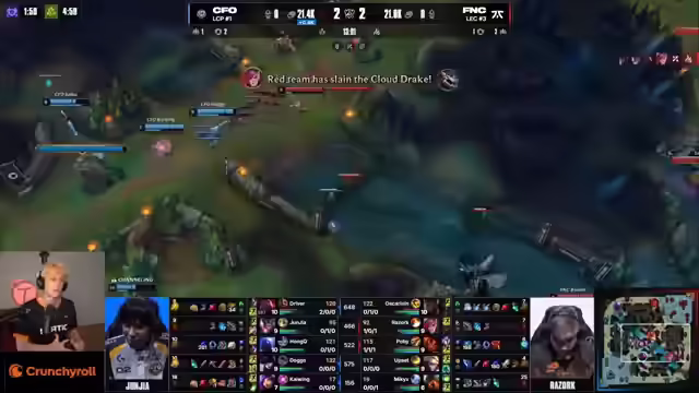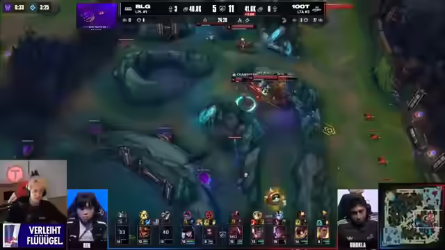 10:28:56Die Analyse der Item-Builds zeigt, dass Cassante mit Icebound, Gordert und Jugshow parallel skaliert, was ihm erlaubt, gegen Zaun und andere Gegner zu bestehen. Ein Botlane-Play endet ohne Blutvergießen, aber mit getauschten Flashes auf der Top-Lane. Die Zuschauerzahlen werden thematisiert, wobei die frühen Spiele für das chinesische Publikum suboptimal sind, während spätere Spiele mit Korea-China-Matchups mehr Aufmerksamkeit erhalten. Die wiederholten Solo-Kills von Driver gegen europäische Spieler werden als 'illegal' und 'crazy' bezeichnet, da sie das Spielgeschehen stark beeinflussen. Trotz dieser Rückschläge gelingt es Fnatic, den Drake zu sichern, was als guter Tempo-Death bewertet wird. Driver wird als 'Fanatic Slayer' bezeichnet, der mit seinen Solo-Kills das Spiel maßgeblich prägt. Die Diskussion über die 'illegalen' Kills von Driver unterstreicht seine Dominanz und die Schwierigkeit, ihn zu stoppen. Die Item-Wahl von Oskar wird erneut hervorgehoben, da er trotz des Widerstands gegen Zaun bestehen kann. Ein Teamfight um den Herald geht zugunsten von Taiwan aus, da die Niko-Ult den Kampf entscheidet und Fnatic gestompt wird. Die fehlende Niko-Wahl von Fnatic wird kritisiert, da sie stattdessen Elsin und Cassante pickten, die weniger nützlich waren. Driver's aggressives Proxy-Farmen auf der Bot-Wave wird gelobt, während Oskar erneut eine ganze Wave verliert und damit Gold einbüßt.
